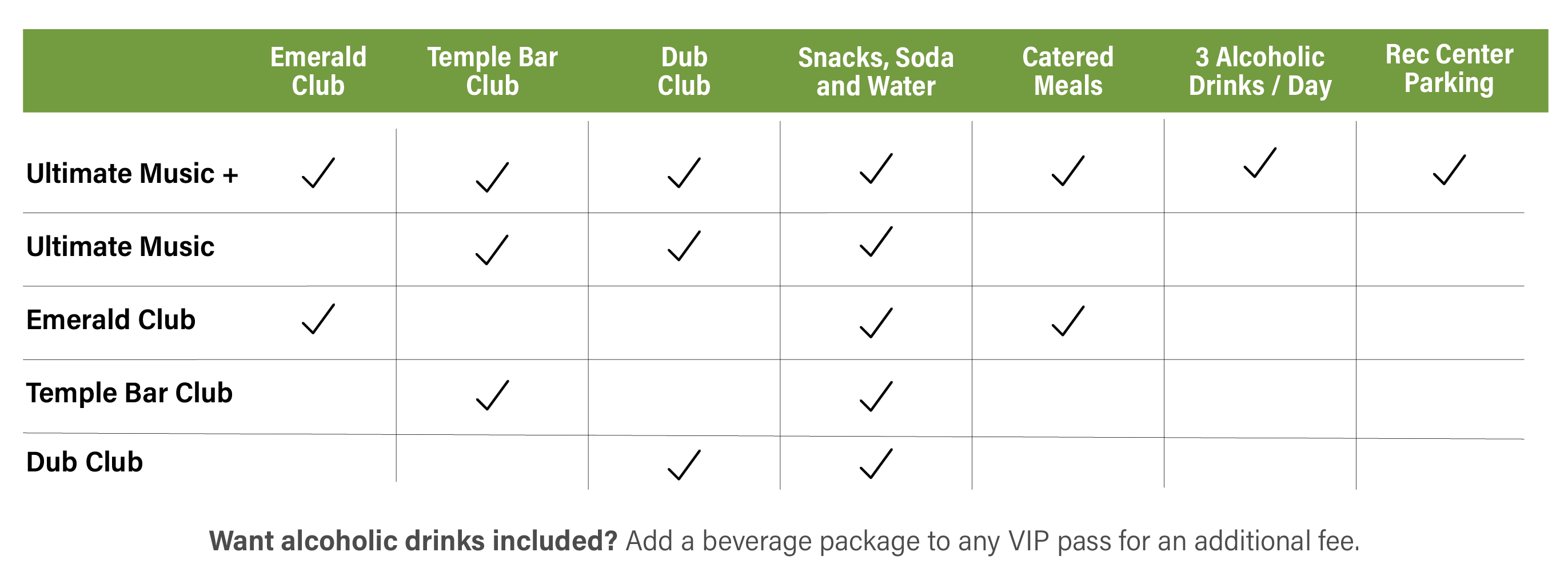 - This package includes access to all three VIP Clubs with covered seating, stage views, catered meals (Emerald Club only), snacks, soda, water, three alcoholic beverages per day and one VIP parking pass (per household) in the Rec Center Lot.